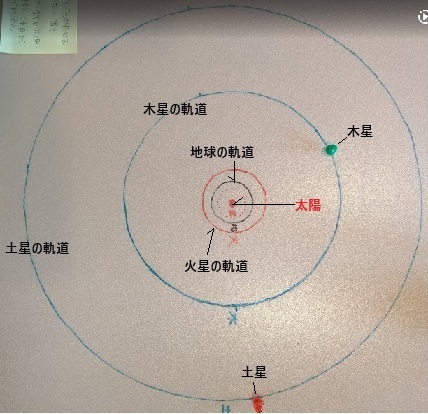 ここで、東南西で夜空をイメージすると、夜中の12時には、西の端に土星が見えて、南東の空に木星が見えることがわかります。