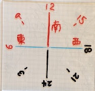 時空盤には、時計の様な時刻表示と、東・南・西の方位表示があります。