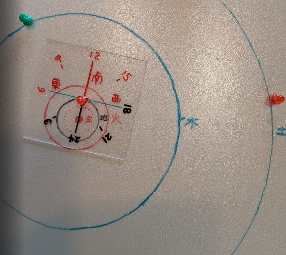 写真では木星と火星の位置を押しピンで示しています。時空盤の中心が地球の位置です。写真では、時空盤の時刻24が太陽の方向に向いています。