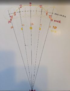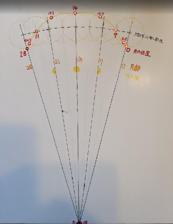一番下に太陽があり、地球の軌道上に一か月分の月齢と地球の位置の関係を示してます。