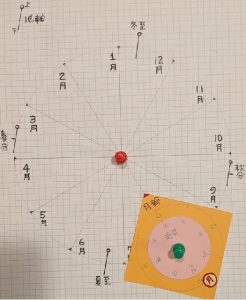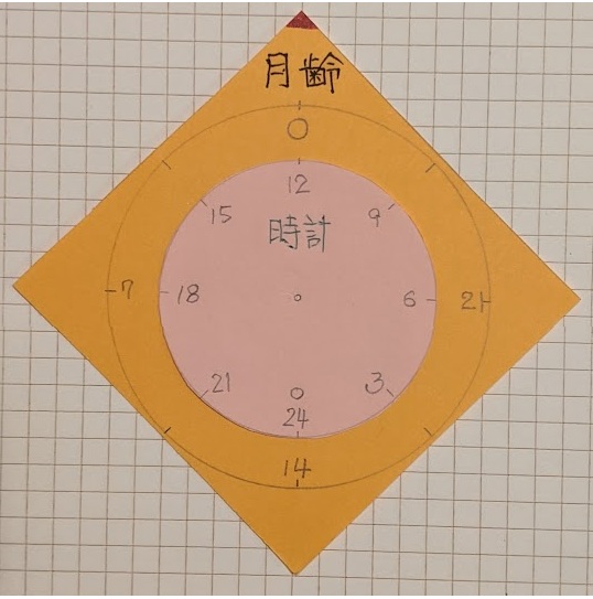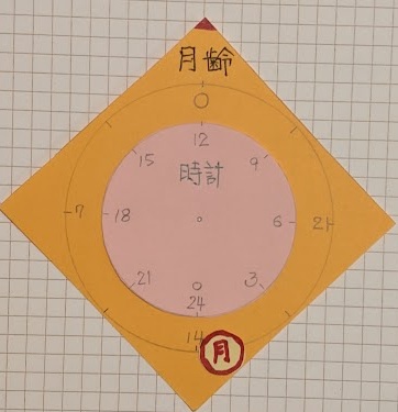 中心が地球で、外側の円が月齢、内側の円が時刻を示す。