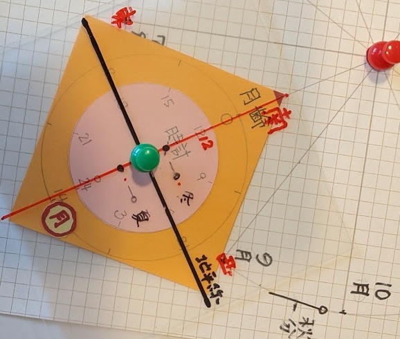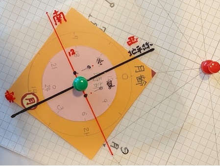 南を向いて眺めた夜空になる。黒線が地平線で、赤の垂線が南の空を示す。中央にピンホールがあり、回転することにより東の地平線から月が登ってくる。